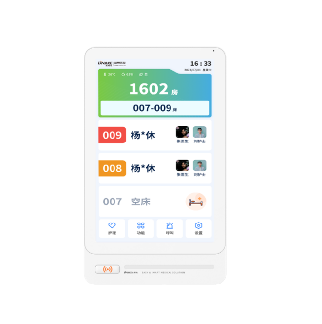 設(shè)置在病房門口的終端設(shè)備,主要用于顯示病房相關(guān)信息,內(nèi)置簡易醫(yī)護工作站,支持病房床位一覽、患者動態(tài)跟蹤、呼叫對講、增援求救等多種呼叫類型,信息齊全,及時響應(yīng)醫(yī)護需求,實現(xiàn)智能化醫(yī)護管理。